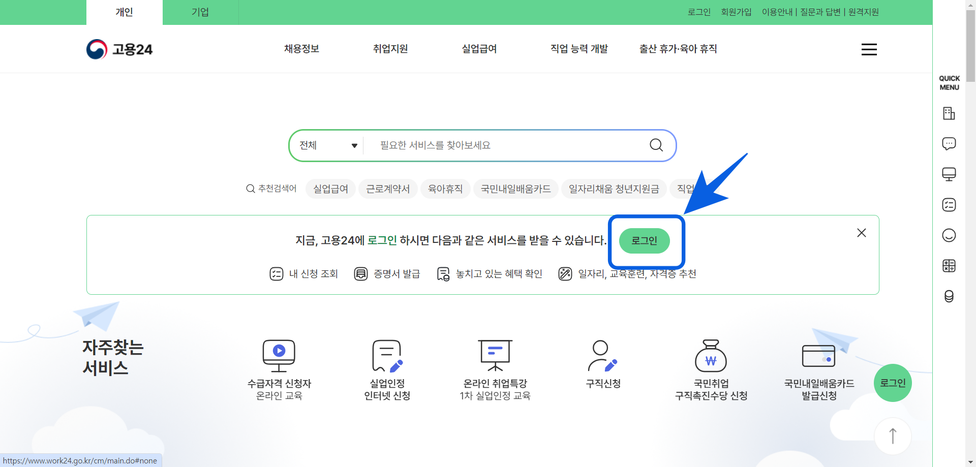 1. 고용24 홈페이지에 접속하여 로그인을 눌러준다.