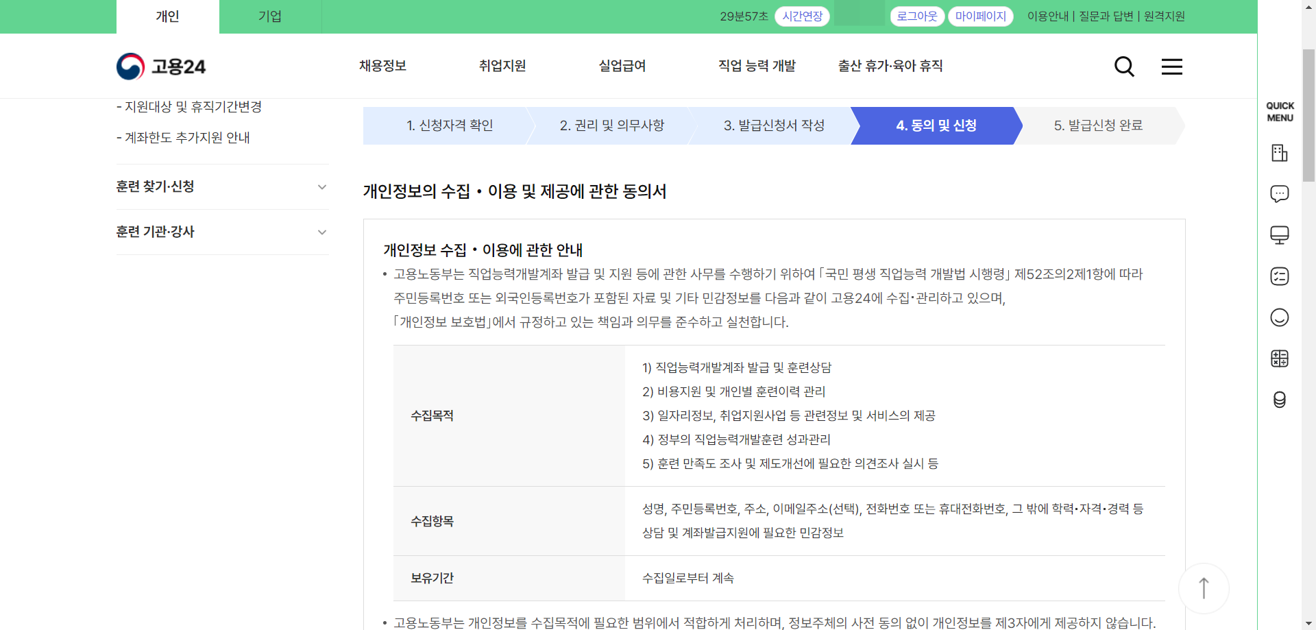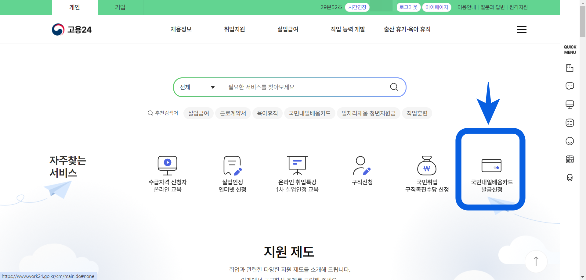 4. 로그인이 되었다면 고용24 첫 화면의 국민내일배움카드 발급신청을 눌러준다.