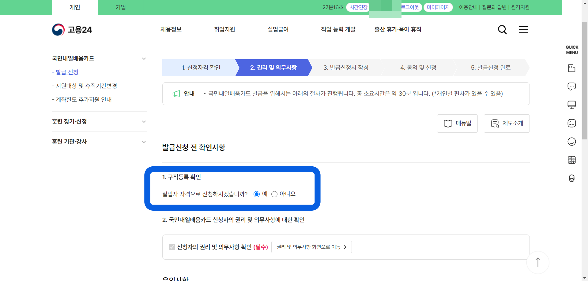 5. 신청 전 확인 사항에서 현재 실업자일 경우 '구직신청'을 먼저 진행한 후 국민내일배움카드 발급을 신청하여야 한다.