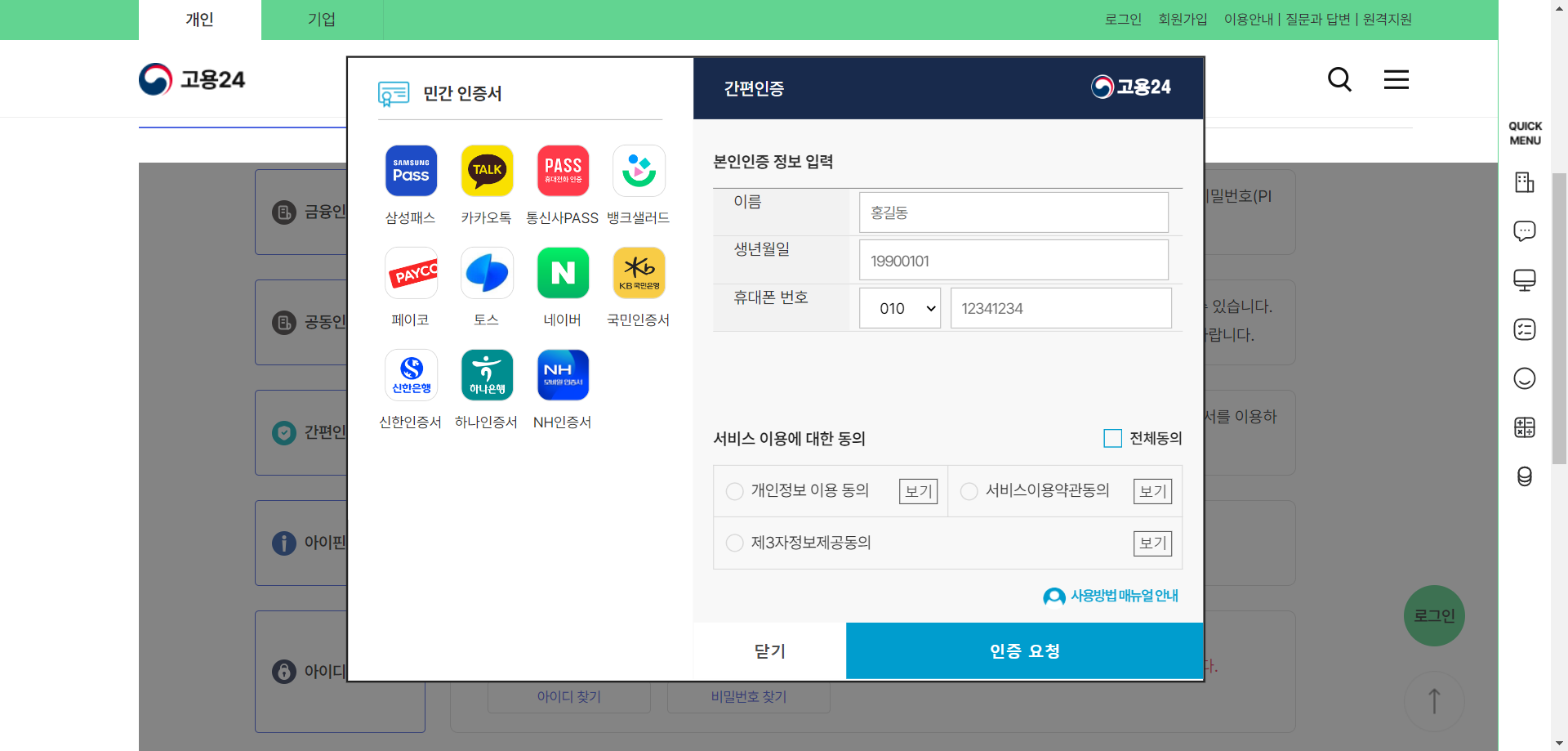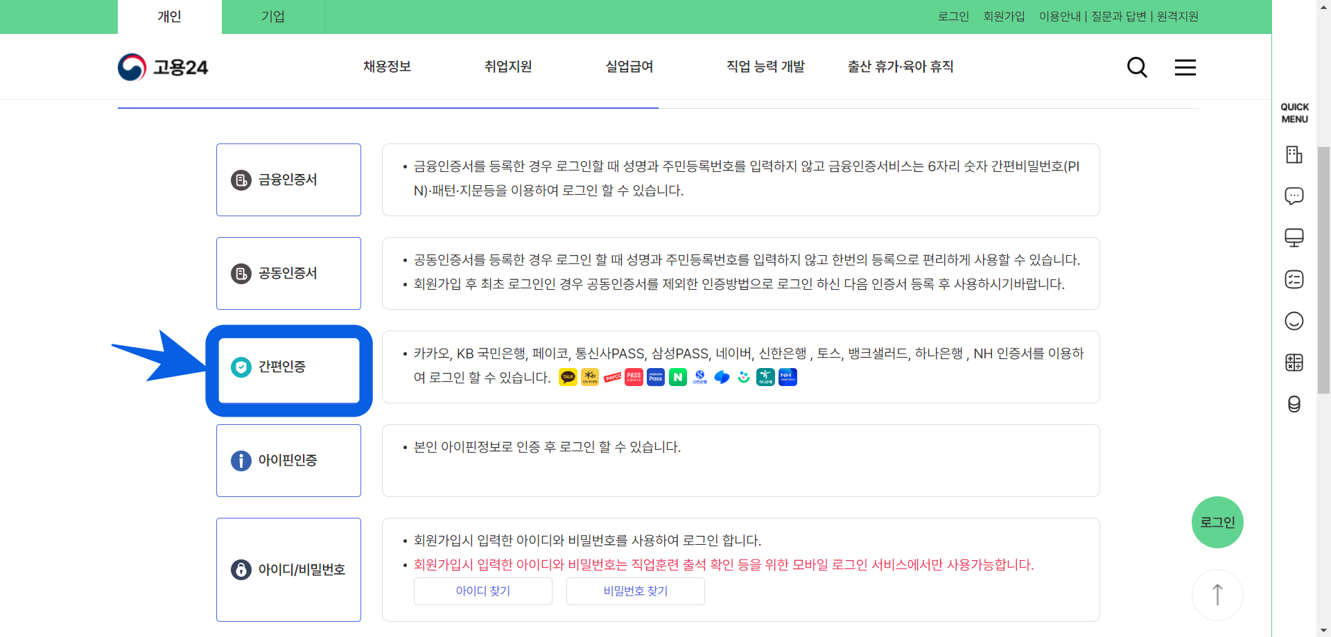 2. 편한 방법으로 로그인을 진행해 준다. SNS나 은행 인증서가 있는 경우 간편 인증이 편하다.