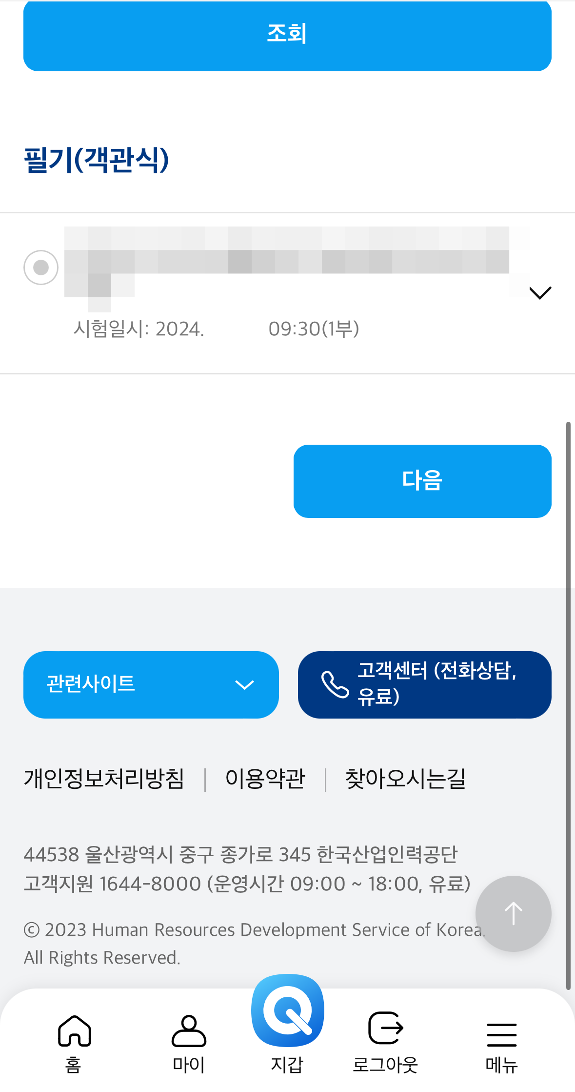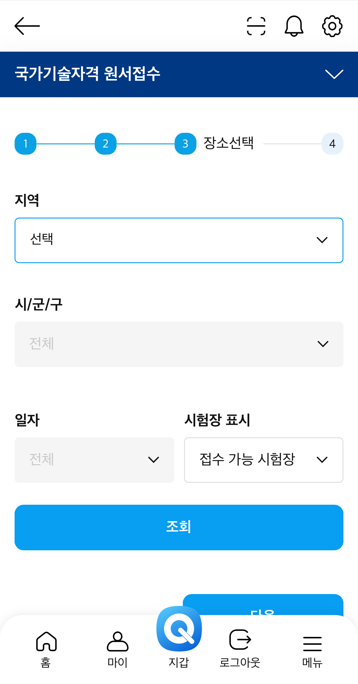7. 본인이 시험 볼 지역을 선택하여 조회를 눌러준다.