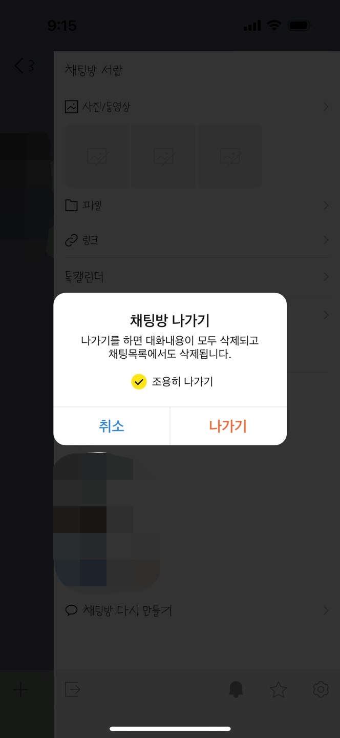 다만, 1:1 카톡방과 오픈 카톡방에서는 조용히 나가기 기능을 사용 할 수 없다.