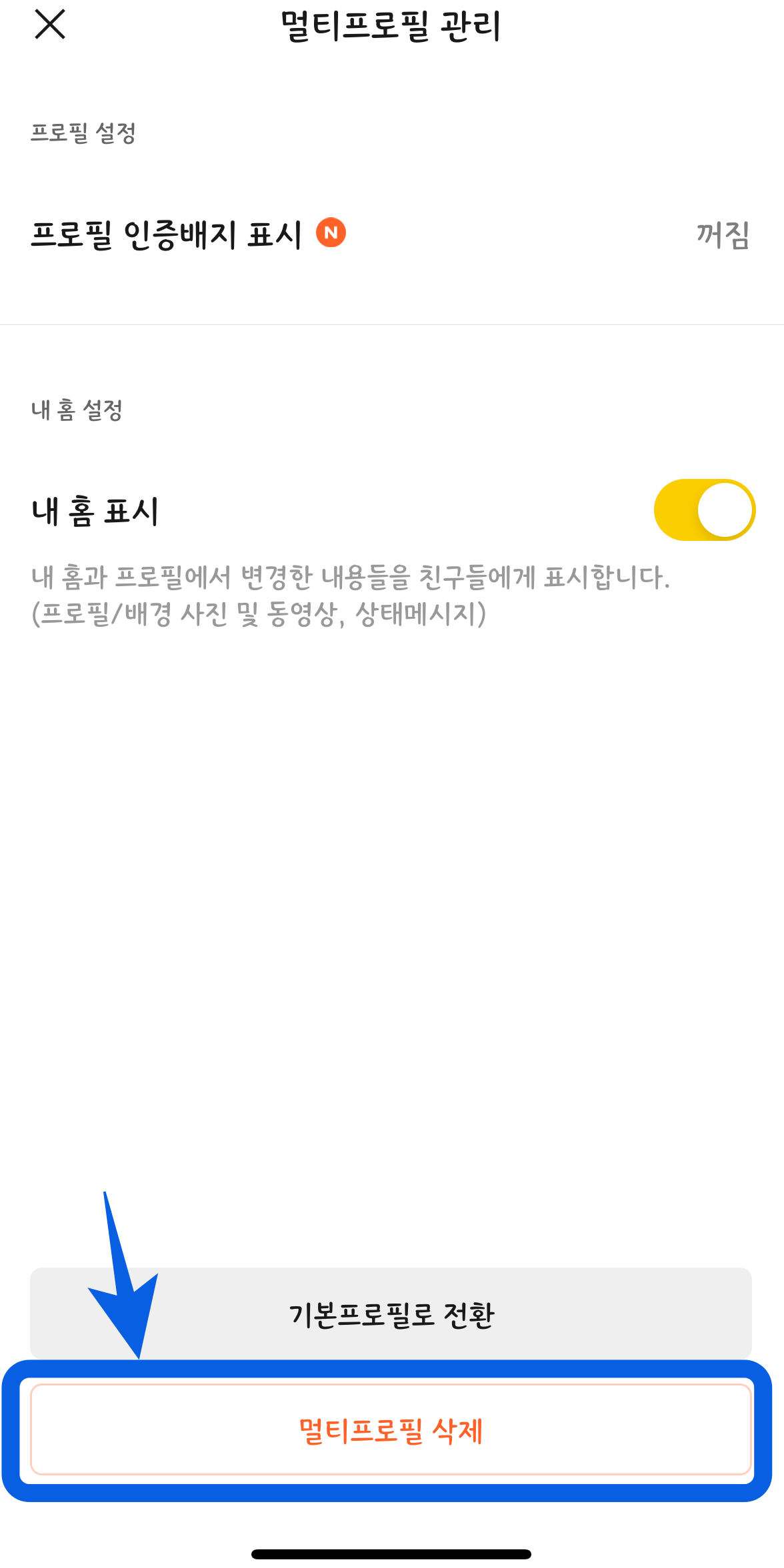 2. 맨 밑의 '멀티프로필 삭제'를 눌러주면 멀티프로픽이 삭제된다.