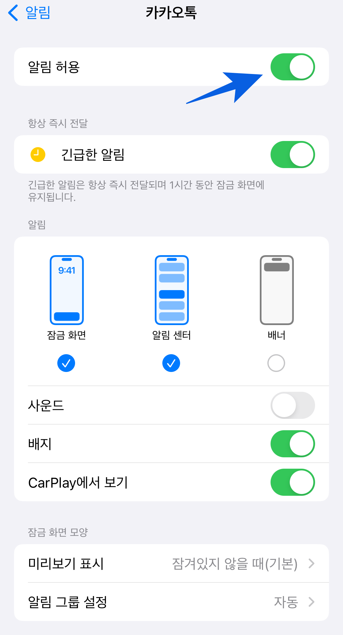 카카오톡 어플의 알림이 꺼져 있을 수도 있다. 아이폰 기준으로 설명해 보겠다.