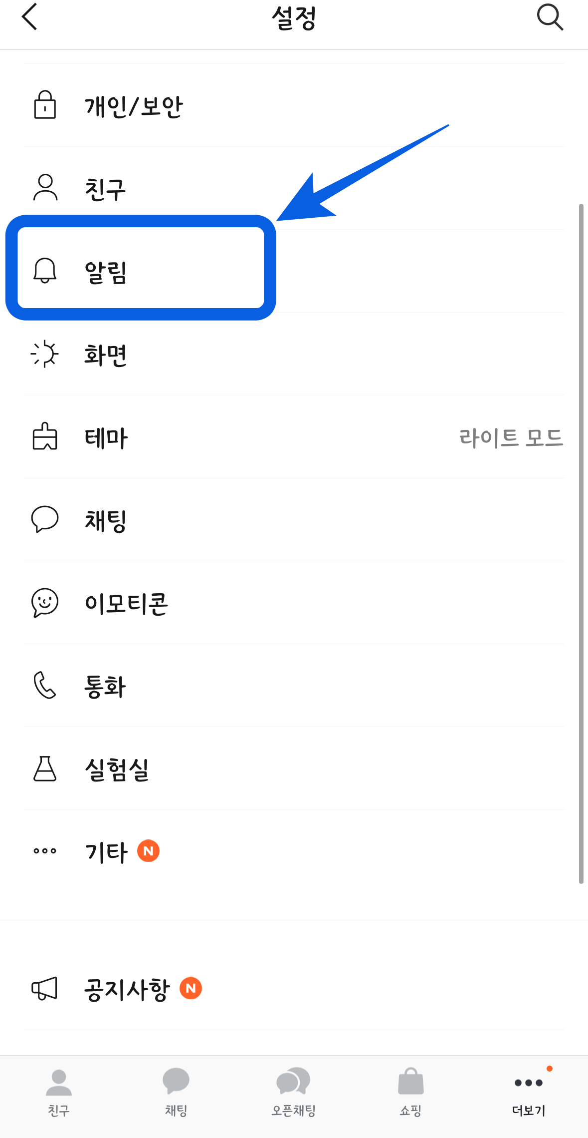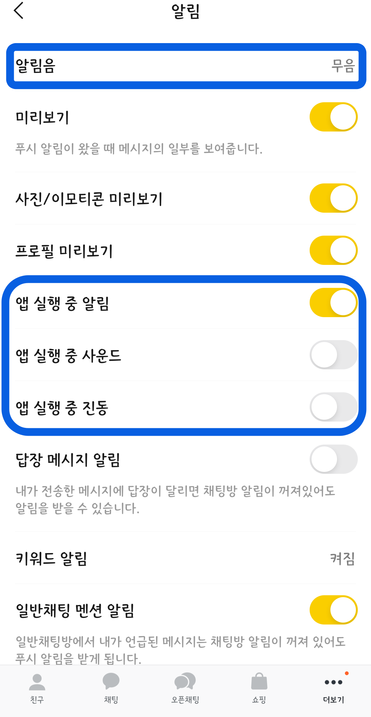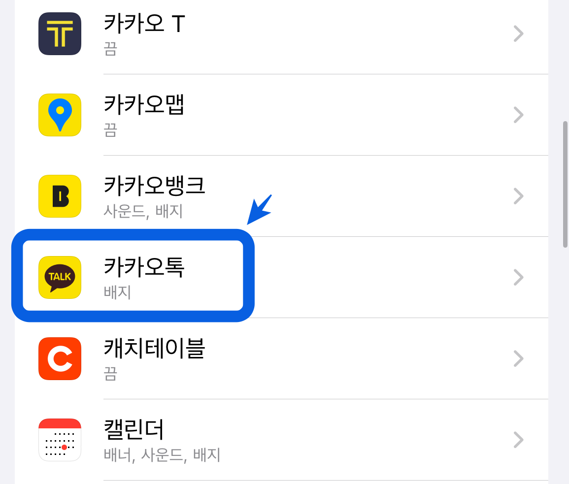 카카오톡 어플 자체의 알림 설정을 확인해 볼 수 있다.