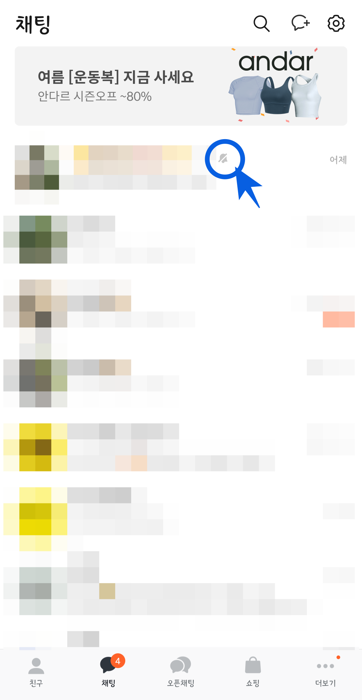 카카오톡 각 채팅방의 알림 설정을 확인해 볼 수 있다.