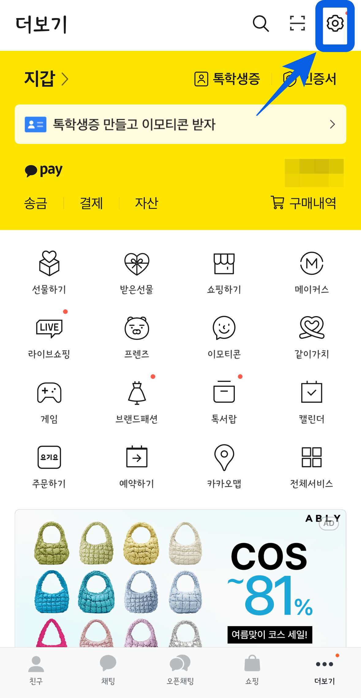 2. 화면 우측 하단 더 보기를 누른 후 오른쪽 상단의 설정(톱니바퀴)을 눌러준다.